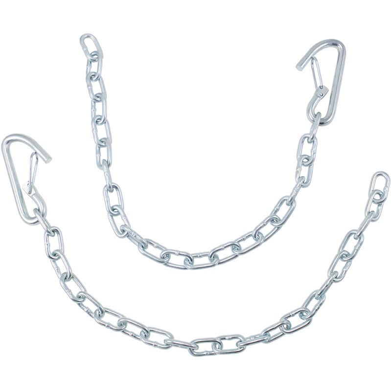 Cadenas de eslabones soldados clase 1 de servicio pesado para remolques de hasta 2000 lb Acabado galvanizado para resistir la oxidación, con gancho de acero pesado y clip de seguridad que se engancha para mantener las cadenas unidas al vehículo remolcador. Tamaño de cadena de 3/16 de pulgada, monte con pernos de 3/8 de pulgada. Cumple con los estándares SAE y V-5. Dos cadenas de 24 pulgadas por paquete. NOTA: No monte las cadenas en la lengüeta del remolque con los mismos pernos utilizados para montar el acoplador. Cruce las cadenas de seguridad debajo del acoplamiento, permitiendo solo suficiente holgura para las vueltas.