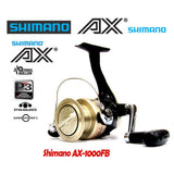 Shimano AX 1000 FB es un carrete giratorio de bajo costo, aprobado para su uso en agua salada. Este carrete es parte de la línea P3 de Shimano, que enfatiza la potencia (que se deriva de la eficiencia del tren motriz del carrete), la precisión (que resulta de la disposición uniforme de la línea, proporcionada por el sistema de oscilación Varispeed) y el rendimiento (que es el resultado final del primeras dos Ps). La construcción del carrete incluye el Dyna-Balance, Power Roller II, Varispeed, Super Stopper II requeridos. También incluye el sistema de gestión de la línea de propulsión, carrete de aluminio fundido a presión, doble propósito: izquierda / derecha, marco de grafito, placa lateral y rotor, tope instantáneo. El carrete está clasificado para su uso con líneas Mono, Fluorocarbon y PowerPro.